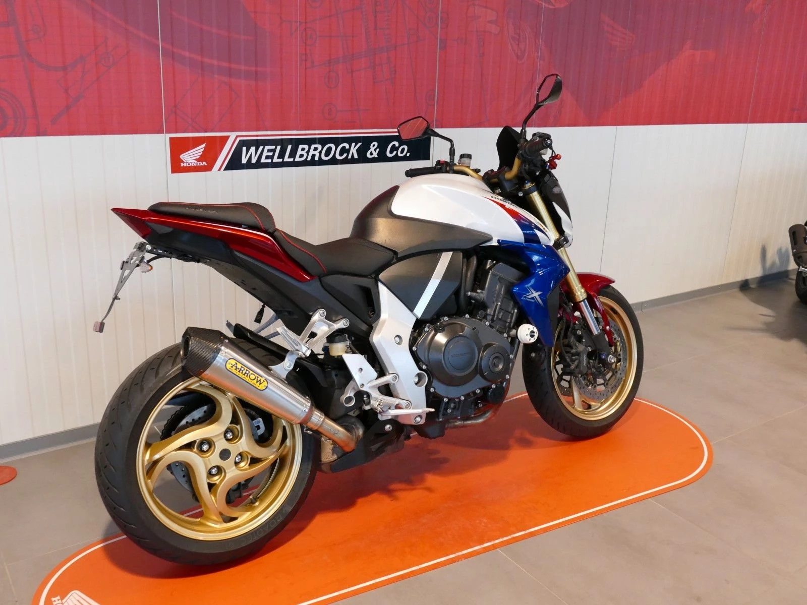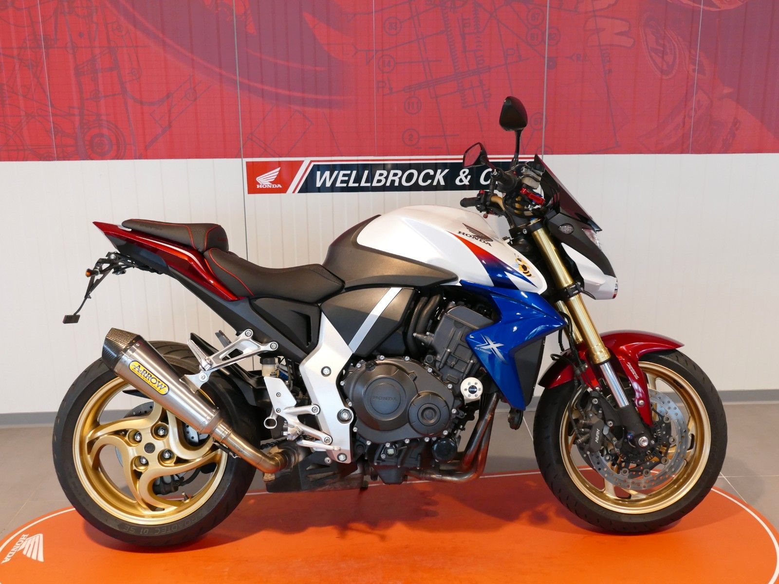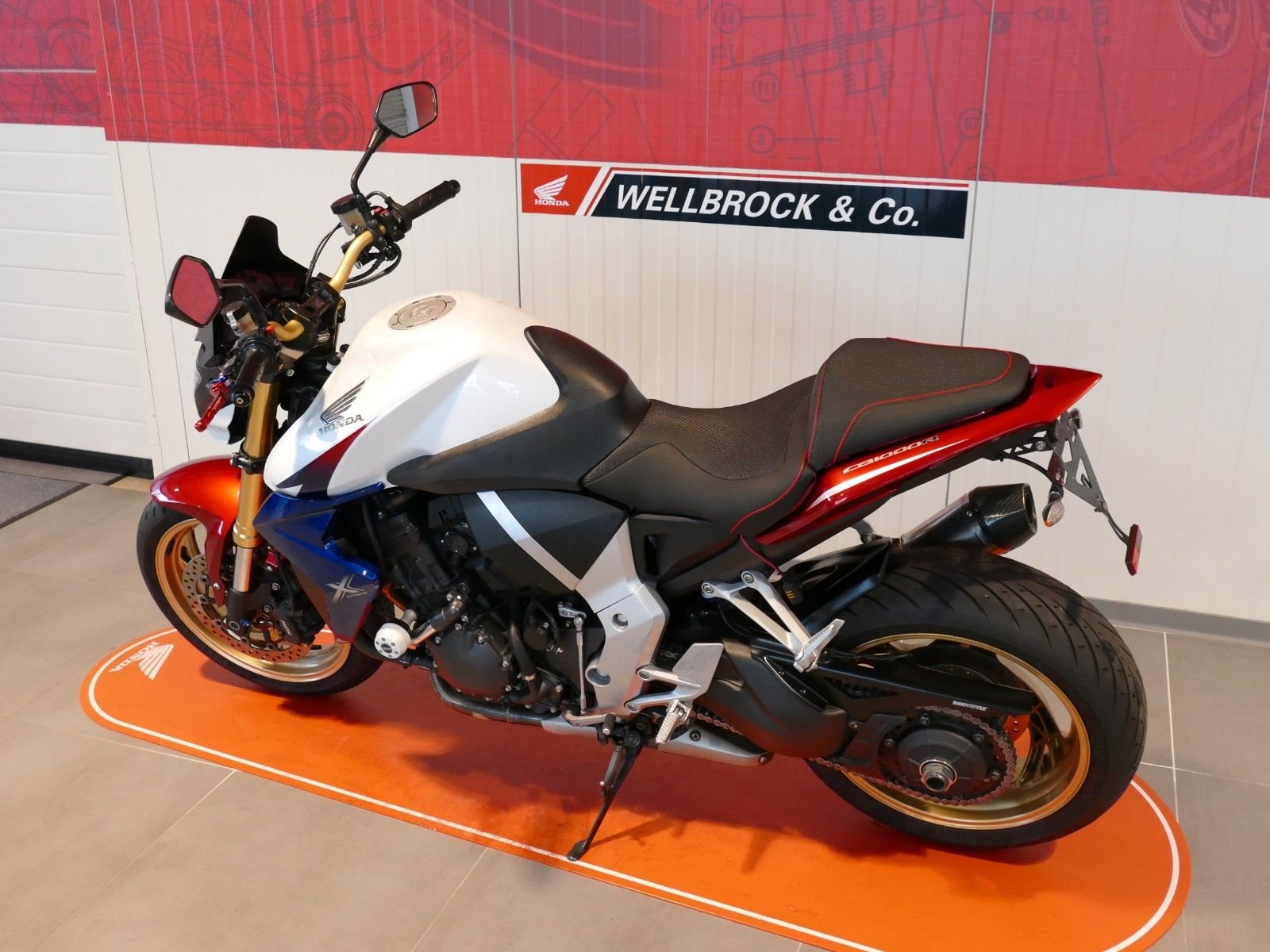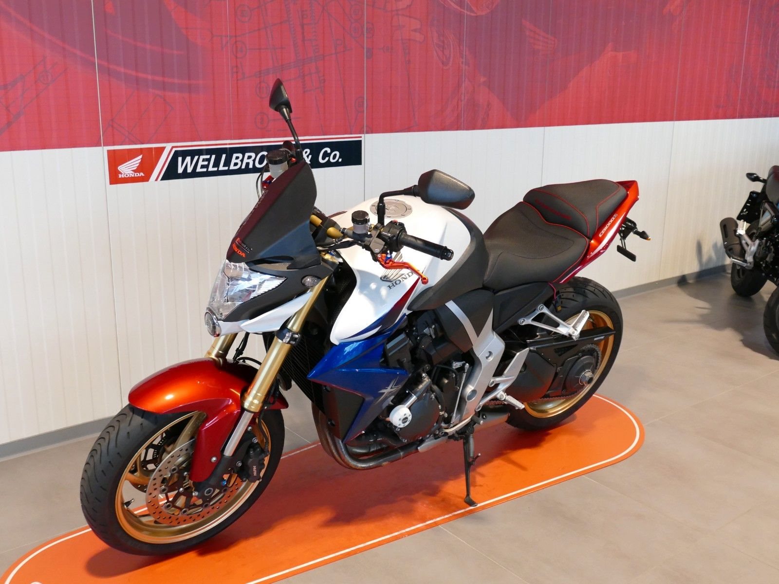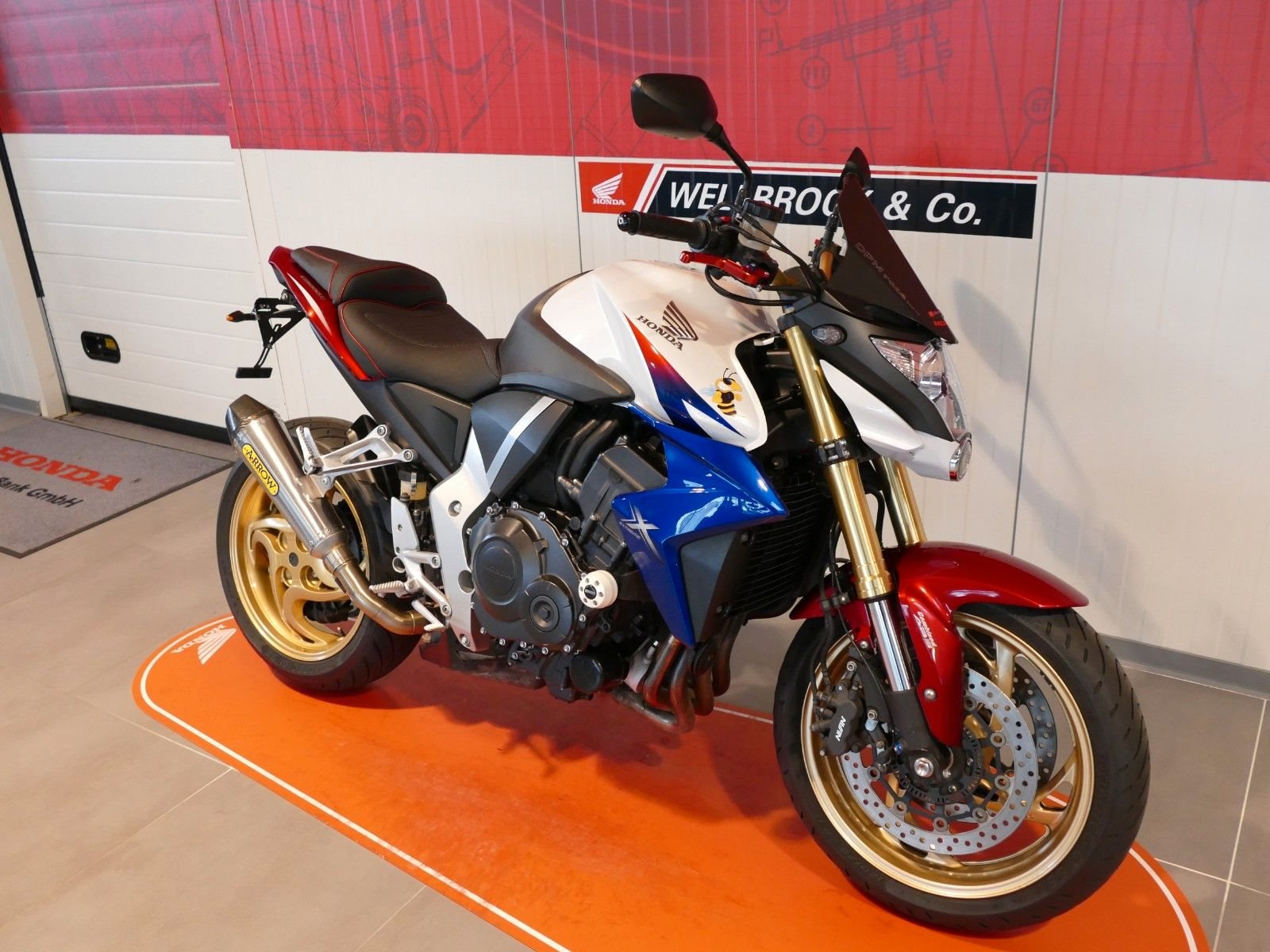 Honda CB1000R aus vierter Hand. Das Fahrzeug verfügt über einen kurzen Kennzeichenhalter, Arrow Auspuff, DPM Windschild, Sturzpads, Ganganzeige, V-Trec Hebel sowie eine Bagster Sitzbank. Die Maschine hat von uns frisch den Jahreskundendienst erhalten. Es sind mehrere Kratzer an den Lenkerenden, Sturzpads, Heckverkleidung, Spiegel und der Seitenvverkleidung unter dem Sitz rechts vorhanden. Finanzierung möglich. Unfallfrei.